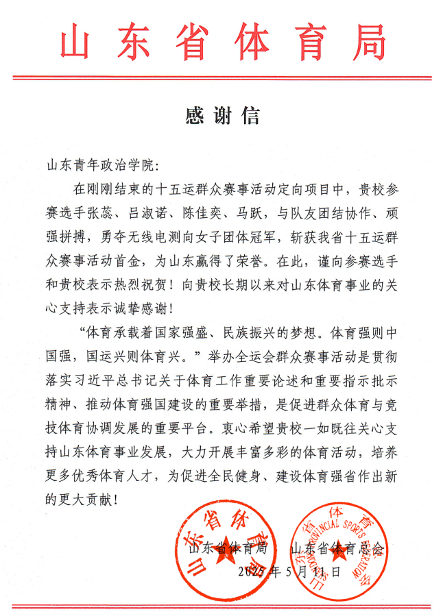 此次夺金不仅是竞技成绩的突破,更是学校体育育人理念的生动实践。参赛学生中,张蕊、马跃等均为在校学生,其拼搏精神与团队意识成为校园体育文化的鲜活范例。山东省体育局在感谢信中特别指出,学校通过定向运动“激发青少年科技素养与团队合作精神”,为体育强国建设注入新活力。未来,学校将进一步深化体教融合,持续优化体育课程体系,推动新兴项目普及,拓展校际合作,助力全民健身与竞技体育协同发展。不断探索“体育+科技”特色育人路径,为培养德智体美劳全面发展的社会主义建设者贡献更大力量。