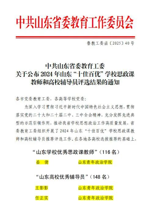 近日,中共山东省委教育工委公布了2024年度山东“十佳百优”学校思政课教师和高校辅导员评选结果,学校马克思主义学院教师岳倩荣获“山东学校优秀思政课教师”荣誉称号,经济管理学院任正实、外国语学院王影影荣获“山东高校优秀辅导员”荣誉称号。