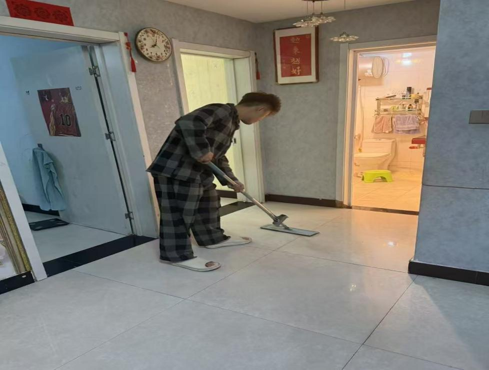 25级休闲体育2班张景镐以每日拖地为劳动实践,从客厅到房间认真清理污渍与死角,在简单的家务中锻炼耐心与细心,也真切感受到家人的辛劳,懂得了珍惜与感恩。他认为劳动是成长的必修课,将始终躬身劳动,在点滴小事中锤炼意志、提升能力,精益求精做好每一件小事。