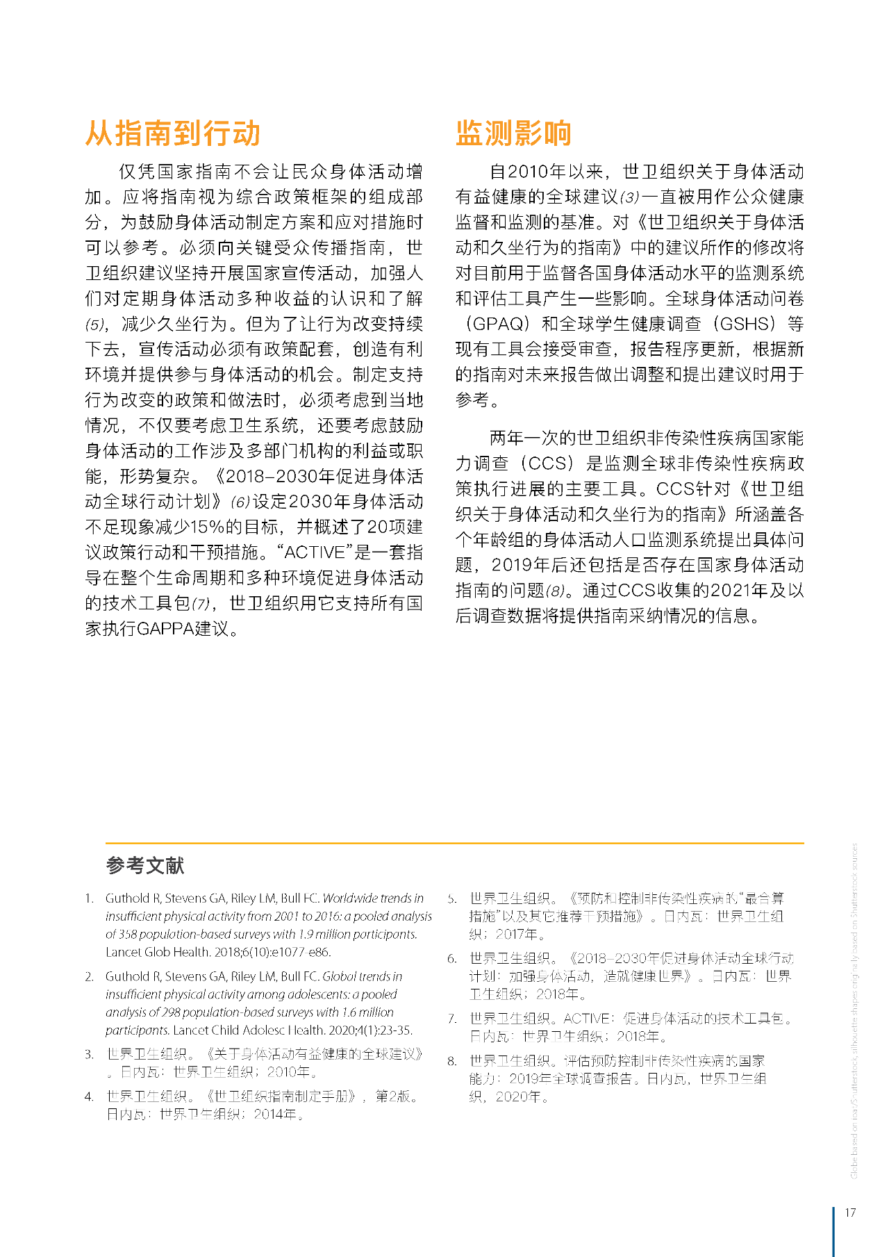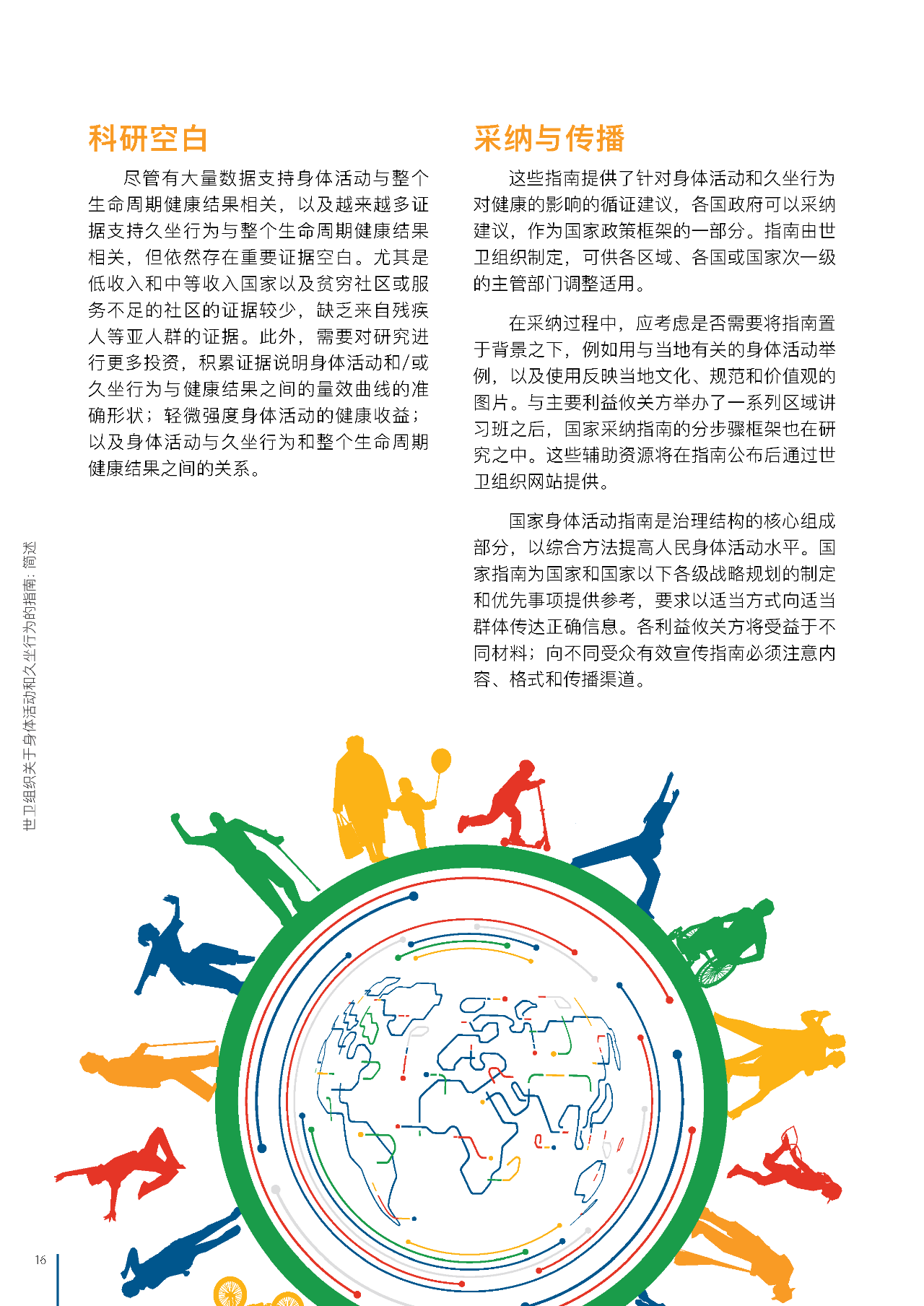 2020年11月25日,世界卫生组织发布了最新的《关于身体活动和久坐行为指南》(WHO guidelines on physical activity and sedentary behaviour),新指南针对儿童、青少年、成年人和老年人等不同年龄群体,孕妇和产后妇女以及患有慢性疾病或残疾的人提供了有关身体活动和久坐行为最新的具体建议。